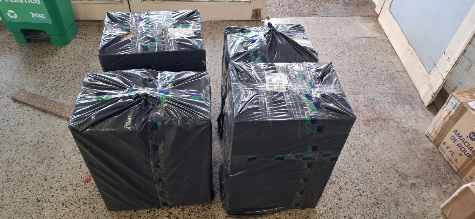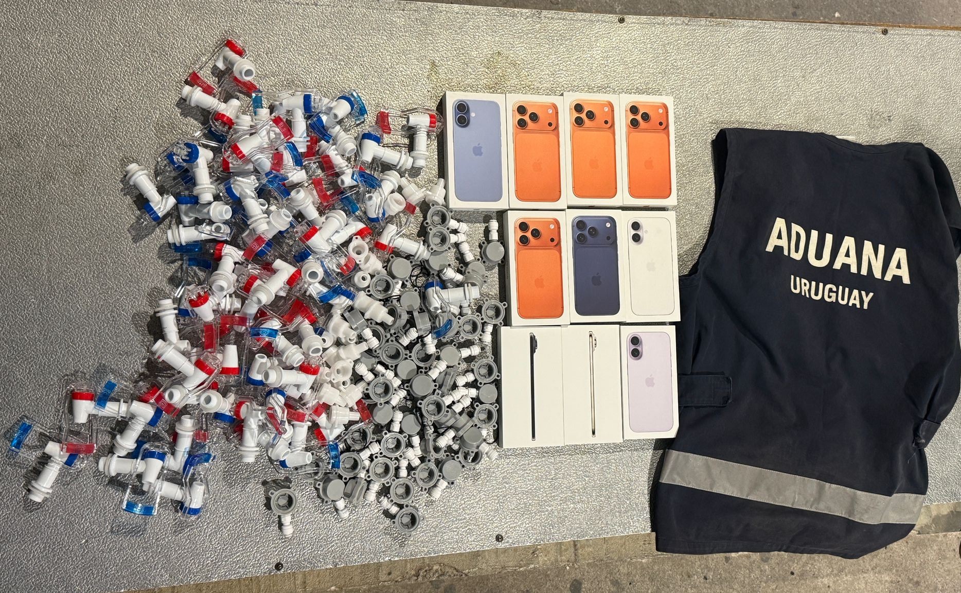 Concretamente se encontraron 10 celulares iPhone (5 iPhone 17 Pro, 3 iPhone 17 y 2 iPhone Air) y 129 partes de dispensadores de agua, con un valor estimado cercano a los 18.000 USD.