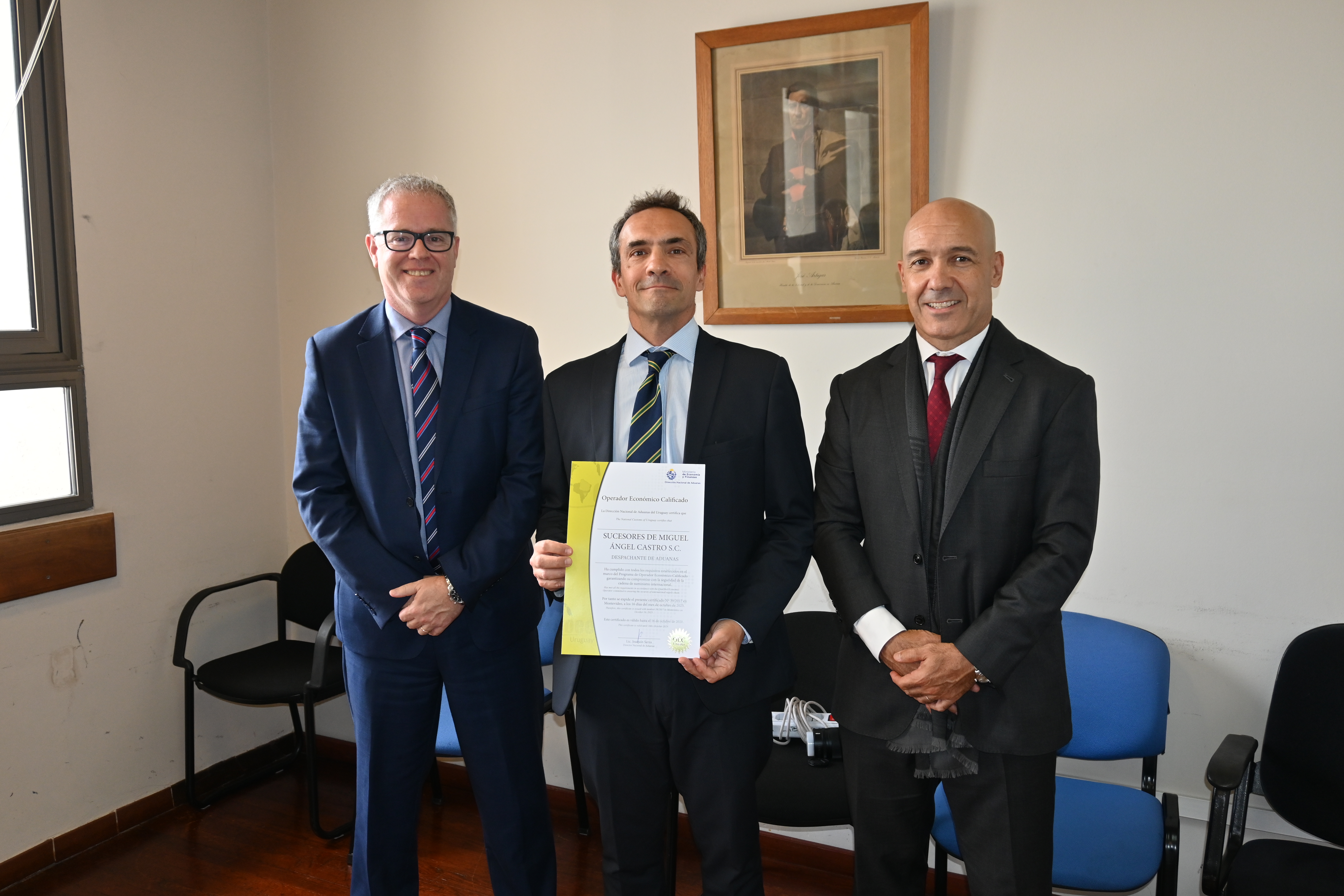 La distinción fue recibida por el Sr. Germán Pereira, Director de la empresa, y el Sr. Nicolás Risso, Representante OEC. Por la Dirección Nacional de Aduanas participó el Gerente del Área Gestión de Comercio Exterior, Lic. Álvaro Palmigiani, la Lic. Mayra Pérez, Directora del Departamento Operador Económico Calificado, y su equipo.