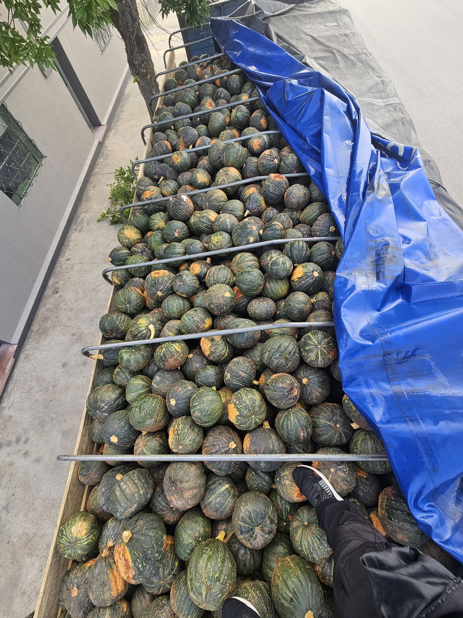 Minutos más tarde, en el mismo lugar, se interceptó un camión con doble zorra cargado con 28 mil kilogramos de zapallos. El vehículo era conducido por un ciudadano uruguayo que no contaba con la documentación de la mercadería transportada, manifestando que se trataba de zapallos de origen brasileño que trasladaba desde la frontera de Livramento-Rivera, y su destino final era la comercialización en la zona metropolitana.
