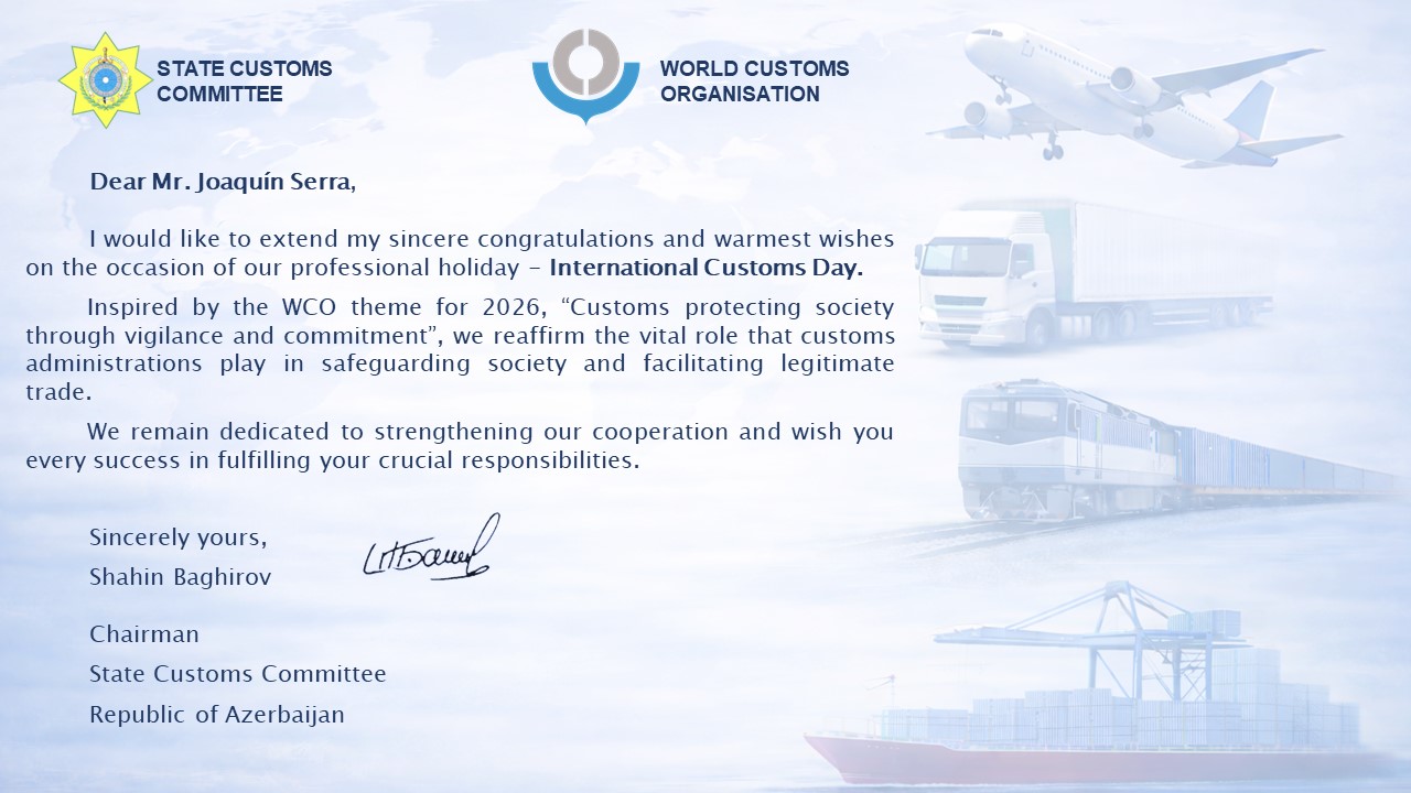 La misiva es firmada por el Presidente del Comité Estatal de Aduanas de Azerbaiyán, Sr. Shahin Baghirov. En ella expresa sus más sinceras felicitaciones y mejores deseos con motivo de esta festividad, deseando mucho éxito al Lic. Joaquín Serra en el desempeño de sus responsabilidades al frente de la DNA.