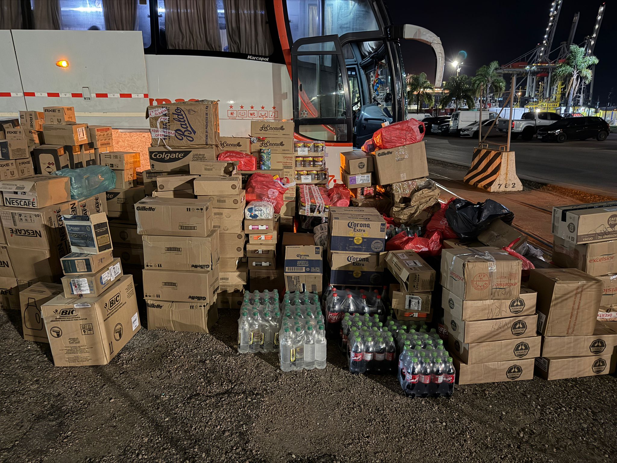 Entre los productos encontrados se encuentran 4020 cigarrillos marca Classic, 1211 frascos de Nescafé de 200 gramos, 128 frascos de café Pelé de 500 gramos, 185 latas de café Iguazú de 200 gramos, 203 frascos de café Melita de 500 gramos, 34 frascos de Nescafé Gold, 4620 cápsulas de Nescafé Dolce Gusto, 6 paquetes de café L´or de 130 gramos, 1056 jabones Dove de 90 gramos, 5 frascos de Capuccino Iguazú de 200 gramos, 6 frascos de café Gourmet de 250 gramos, 172 desodorantes Axe de 200 ml, 545 desodorantes Dove de 250 ml, 60 botellas de Whisky Johnnie Walker Rojo, 12 botellas de Whisky Sandy Mac, 164 desodorantes Axe de 152 ml, 12 botellas de whisky Sir Edwards, 6 botellas de Fernet Branca de 1 litro, 12 botellas de licor Jägermeister de 700 ml, 168 cervezas Corona de 355 ml, 12 botellas de Whisky Olden Wack, 2 botellas de Vodka Kisilla de 1 litro, 19 botellas de vino Sangue de Boi de 750 ml, 24 desodorantes Rexona de 50 ml, 73 desodorantes Dove de 50 ml, 1677 pastas de dientes Colgate de 180 gramos, 194 frascos de crema Fisiofort de 150 gramos, 24 paquetes de pasta dental adhesiva Fixodent de 68 gramos, 12 pastas de dientes Colgate de 70 gramos, 7 enjuagues bucales Colgate de 250 ml, 9 frascos de crema Alivio Mágico de 290 gramos, 540 máquinas de afeitar BIC, 672 máquinas de afeitar Gillette, 4 juegos de sábanas Queen, 96 botellas de Coca Cola de 600 ml, 61 botellas de Coca Cola de 2 litros, 90 kilos de porotos, 12 botellas de Coca Cola de 3 litros, 2 repelentes Off de 100 ml, 4 repelentes Off de 200 ml, 8 repelentes Off de 170 ml, 19 paquetes de toallas húmedas de 120 unidades, 236 kg de sal, 6 frascos de esencia de vainilla de 960 ml, 15 kg de yerba, 29 kg de yerba Baldo, 9 jabones Vanish, 26 paquetes de caramelos de 500 gramos, 2 aceites lubricantes 4T, 70 paquetes de Nutella de 350 gramos, 15 paquetes de Nutella de 650 gramos, 24 encendedores BIC, 21 latas de paté de atún de 170 gramos, 28 edulcorantes Adocyl de 200 ml, 480 paquetes de Geladinho, 11 paquetes de tapioca de 1 kg, 30 paquetes de chocolatada Piracanjuba de 200ml, 9 botellas de Coca Cola de 1 litro, 330 cajas de bombones Garoto, 36 refrescos de 200 ml, 8 botellas de Guaraná Antártica de 2 litros, 90 tabletas Garoto de 80 gramos, 12 kilos de lentejas, 5 kilos de arroz, 14 kilos de granola, 239 paquetes de ticholos, 1 paquete de maní tostado, 12 cajas de leche integral de 1 litro, 6 tarros de miel de 1 kilo, 135 energizantes Monster de 473 ml, 23 jabones líquidos Ariel de 2 litro, 72 energizantes Red Bull de 250 ml, 12 cervezas Brahma de 473 ml, 36 cervezas Glacial de 473 ml, 30 pares de chinelas Hawaianas, 24 cremas de leche Italac, 90 leches condensadas Italac, 11 frascos de jabón líquido Omo de 5 Litros, 1 jabón líquido Omo de 7 Litros, 4 frascos de jabón líquidos Confort de 1,5 litros, 26 toallas, 40 botellas de caña Velho Barreiro, 122 botellas de caña 86, 12 insecticidas Pro Insect de 250 ml, 12 paquetes de farofa de 400 gramos, 6 paquetes de harina de mandioca de 500 gramos, 7 paquetes de pao de queijo de 500 gramos, 10 frascos de goiabada de 1 kilo, 10 paquetes de goiabada de 500 gramos, 11 insecticidas Pro Insect de 750 ml, 1 frasco de dulce de frutilla de 1 kilo, 1 frasco de dulce de ananá de 1 kilo, 1 frasco de requesón de 400 gramos, 6 paquetes de harina de arroz de 1 kilo, 4 paquetes de Nescau de 2 kilos, 5 chocolates Muky de 400 gramos, 14 mezclas para preparar tortas de 380 gramos, 4 chocolates de 350 gramos, 4 paquetes de Nesquik de 390 gramos, 4 paquetes de Toddy de 370 gramos, 8 latas de Nescau de 350 gramos, 85 tabletas de rapadura, 9 frascos de mayonesa Hellmans de 1 kilo, 5 mayonesas Hellman´s de 200 gramos, 3 paquetes de kétchup Hellman´s de 1 kilo, 1 mostaza Hellman´s de 1 kilo, 2 paquetes de pastas de tomate de 1700 gramos, 5 paquetes de gelatina de 1 kilo, 28 sobres de gelatina de 20 gramos, 31 sobres de polvo para preparar refrescos de 170 gramos, 40 caldos Apti de 456 gramos, 20 patés de 100 gramos, 10 latas de sardina de 125 gramos, 10 latas de sardina de 250 gramos, 6 latas de palmitos de 540 gramos, 1 botella de aceite de coco de 500 gramos, 1 paquete de aceite de oliva de 500 ml, 7 paquetes de fideos instantáneo, 20 paquetes de tabaco de 35 gramos, 71 packs L´Oreal, 25 packs Dove, 18 packs Pantene, 16 packs Sedal, 5 packs Jay Luc, 32 frascos de Shampoo Head & Shoulders, 48 cajas de 30 comprimidos de vitamina C Fonty, 30 blíster de 10 comprimidos de dipirona de 500 mg, 48 cajas de 30 comprimidos de Infralax, 4 cajas de 60 comprimidos de complejo vitamínico Take Max, 24 frascos de 120 cápsulas de Omega 3, 30 cajas de 60 cápsulas de Medicaps Hair, 257 kg de mortadela, 2 kilos de masa pastel, 230 kilos de panchos, 2500 gramos de paleta, 1 kilo de panceta y 21 kilos de jamón.