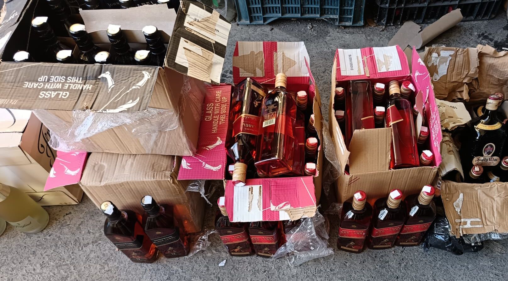 En otro procedimiento equipos del GRIA lograron interceptar a una persona que descargaba de un ómnibus 7 cajas con bebidas alcohólicas en infracción aduanera. Concretamente se encontraron 24 botellas de Whisky Johnnie Walker Gold Label, 24 botellas de Whisky Johnnie black label, 48 botellas de Whisky Johnnie Red Label, 12 botellas de Whisky Sandy Mac y 12 botellas de espumante freixenet.